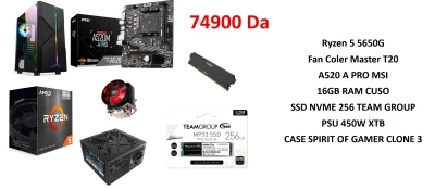 PC GAMER Ryzen 5 5650G Fan Coler Master T20 A520 A PRO MSI 16GB RAM CUSO SSD NVME 256 TEAM GROUP PSU 450W XTB CASE SPIRIT OF GAMER CLONE 3