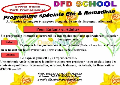 DFD SCHOOL : un centre d’enseignement qui vous donne l’opportunité d’apprendre les langues étrangères: ANGLAIS, FRANÇAIS, ESPAGNOL, ALLEMAND pour tous les niveaux «groupes et pa