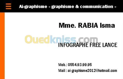 bonjour, infographe free lance a votre service pour tous types de conception graphique : " carte de visite, flyer, affiche, dépliant, brochure, habillage vitrine,... etc"