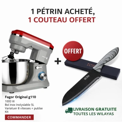 Pétrin FAGOR fg110 ROBOT Pâtissier 1000 W Bol inox inoxydable 5L Variateur 8 vitesses + pulse Kit EUNA couteau de chef NOIR ultra tranchant de 18 cm, avec étui et boîte cadeau, couteau