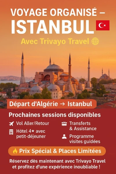 ISTANBUL Voyage - Septembre - octobre -novembre- 2025 Billet d’avion aller-retour avec Turkish Airlines l offre comprend : -Hébergement de 07 nuits 08 jours -hotel marcello / hotel tren