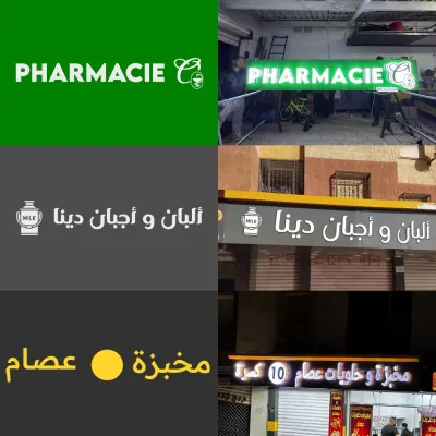 -تصميم و تركيب الكتابات التجميلية على واجهات المحلات التجارية. Conception et montage de textes décoratifs sur les façades des locaux com