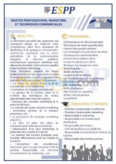 Master professionnel en marketing et technique commerciales à meilleure tarification avec réduction jusq'à 20%; avec pas mal d'avantage /promotion jusqúau 31 Aout. contactez nous sur