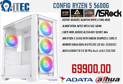 CONFIG R5 5600G A520 16G SSD 512GB * BOITIER XIGMATEC QUANTUM WHITE 4 FANS ARGB * ALIMENTATION ANTEC META V450 140MM * CARTE MERE ASROCK A520M-HDV SOCKET AM4 * AMD RYZEN 5 5600G WITH RADEON