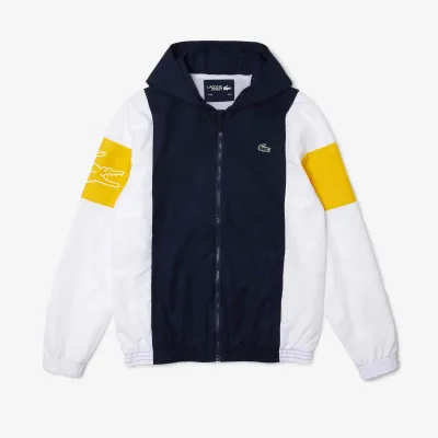 Performance et style pour cette veste zippée color-block signée Lacoste Sport. Conçue en taffetas léger, elle est munie d'une capuche protectrice, d'une doublure en mesh respirant et de