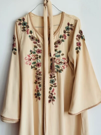 Je mets en vente ce beau caftan perlé beige en bon état porté une seule fois avec une taille de 44 , pour plus d’informations contactez moi