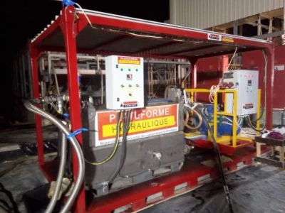 Skid hydraulique complet, conçu pour le flushing pour la maintenance et la filtration des circuits hydrauliques industriels.
