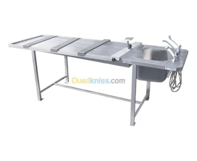 TABLE D’AUTOPSIE AVEC BAC DE LAVAGE Fabriquée en inox et composée d’un plateau de travail et d’un bac de lavage de grande capacité, de douchette, de mitigeur et d’un branchemen