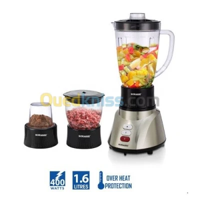 Mélangeur 3 EN 1 SB-160 Caractéristiques du produit : • MOTEUR EN CUIVRE SUPER PUISSANT • BOCAUX ET MOULINS EN PLASTIQUE • AVEC TASSE À HACHER ET COUPE À MOULER • LAME