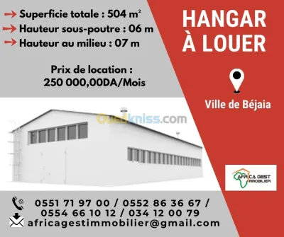 (Réf : LH/350) À cinq (05) minutes du port de Béjaia, agence Africa Gest Immobilier propose aux investisseurs et aux entreprises en location un hangar couvert d’une superficie de 504m²