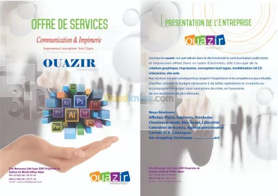 Sarl OUAZIR vous propose ses services pour tous travaux d`impression offset et de finition : • emballages • sac shopping personnalisé • enveloppes personnalisé • Dépliants