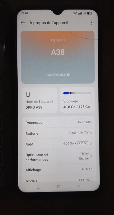 Oppo A38 Avec ça boite et tout les accessoires Stockage 128go Ram 4go Écran 6.56 90hz Double puce