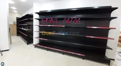 SARL MTM fabrication des étagères murales une face et milieu double face, rayonnage léger, rayonnage mi lourd, rayonnage lourd + des présentoirs des épices + charriot chips + caisse + p
