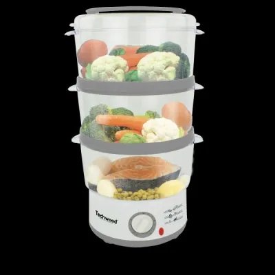 Cuiseur Vapeur TECHWOOD 500 W TCV-750 - Contenance 7,5 litres (avec les 3 paniers) - 3 Paniers amovibles transparents de 2,5L chacun - Paniers utilisables séparément - Minuterie 60 minute