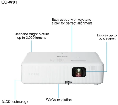 Description ✅INFORMATIONS GÉNÉRALES : ✅Désignation : Epson CO-W01 ✅Marque : Epson ✅Modèle : V11HA86040 ✅Technologie : Système de projection : Technologie 3LCD, Obturateur RVB