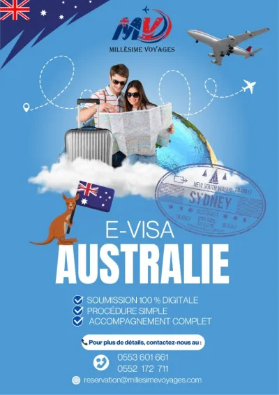 Millesime Voyages vous propose l’E-Visa Australie au tarif de 50 000 DA 🛫 ⏳ Délais de traitement : 08 à 25 jours 📄 Procédure simple avec accompagnement complet 📞 Pour plus