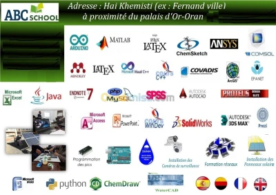 ABC.SCHOOL.ETTAFAWOK assure des formations sur les logiciels suivants : - Arduino - Matlab - Comsol - Solidworks - SPSS - Aumate Programmable ( siemens) - Latex - EndNote -Mende