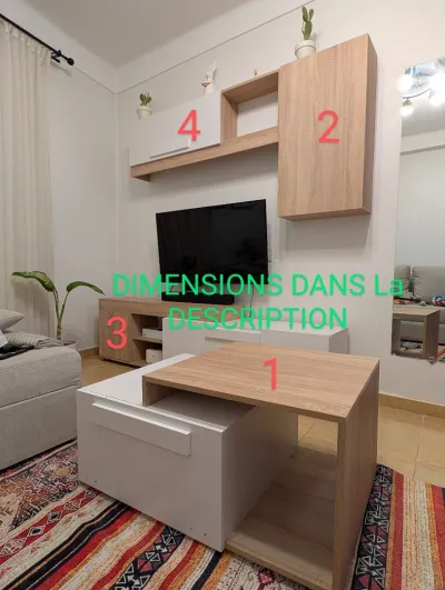 1- 60x90cm 2- 90x50cm 3- 201cm x (51cm partie Beige / 41.5cm Partie Blanche) 4- 140*43,5cm Prix : 39000Da Fixe Livraison non disponible
