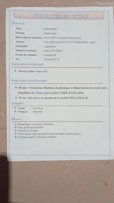 Je cherche un emploi. J'ai de l'expérience dans les domaine Suivant : technicien Machine de plastique et réparation les moules plus chauffeur de Clark chez société saby El Djazaïr 1an
