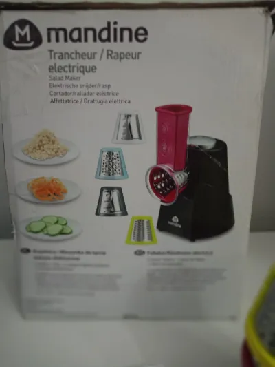 Je vends mon rapeur/trancheur électrique Mandine MSM200-21. Cet appareil polyvalent est idéal pour râper, trancher et couper facilement une grande variété d'aliments. Avec ses différen
