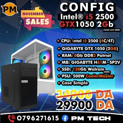 Mobo: Gigabyte h61 Cpu: I7 3770 Ram: 16 gb ddr3 1600 MHz Gpu: GTX 1050ti 4 gb vram Gigabyte Psu: 450 watts Disque dur HDD 256 gb Prix 40000 da négociable