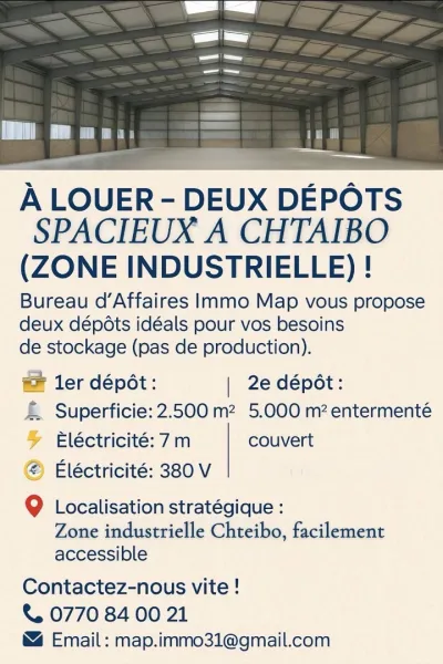 💥À louer – Deux dépôts spacieux à Chtaibo (zone industrielle) ! Le Bureau d’Affaires Immo Map vous propose deux dépôts idéals pour vos besoins de stockage (pas de production) :