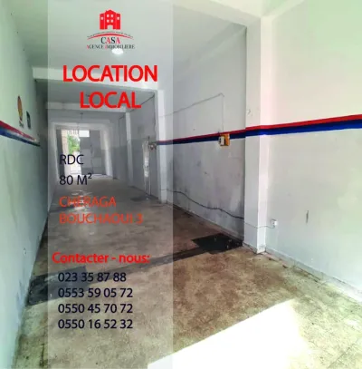 Cheraga, Bouchaoui 3, à proximité de la forêt, Casa Immo propose à la location un local spacieux de 80 m², équipé de toutes commodités : rideau électrique, sanitaires, hauteur sous
