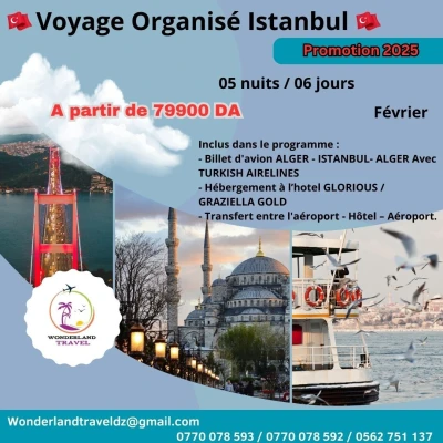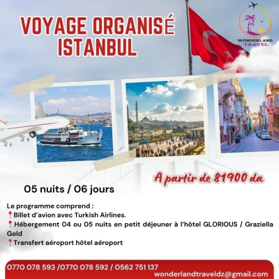 SUPER PROMO Voyage organisé Istanbul 05 nuits /06 jours Le programme comprend : Billet d’avion avec Turkish Airlines. Hébergement 05 nuits en petit déjeuner à l’hôtel Graz