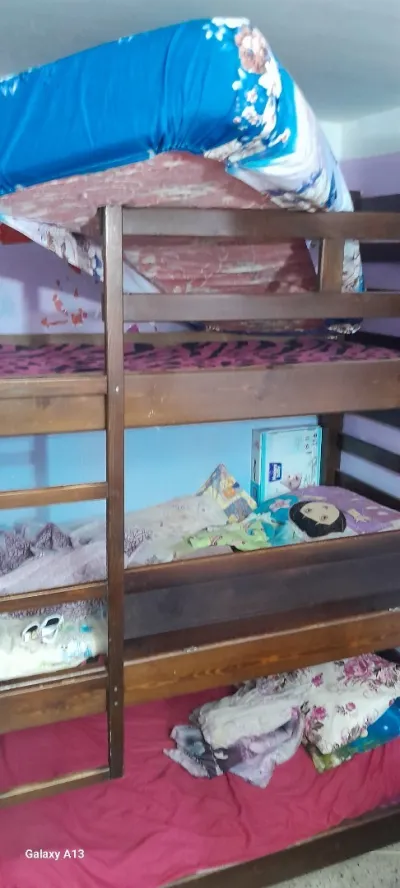 Vend superposés 3 lits, très bon état ,bois rouge, spacieux de dimensions 1,76×90m.
