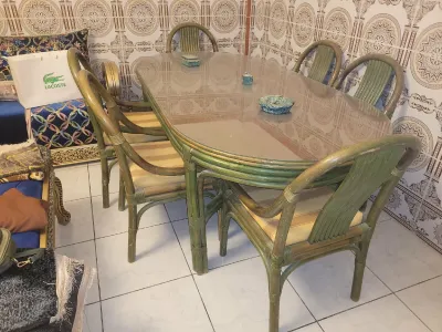 Je vends une table en bambou provenant du Brésil longueur 1.8om largeur 1ml couleur verte avec 06 chaises en bambou convient pour salle à manger ou jardin Façonner à la perfection