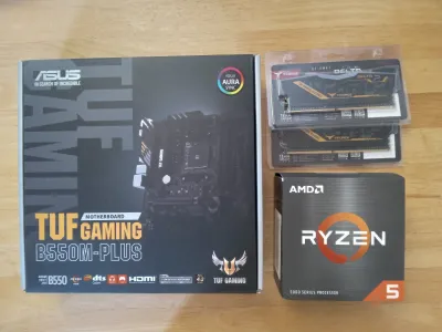 Motherboard : ASUS TUF GAMING B550M-PLUS CPU : RYZEN 5 5600 RAM : TeamGroup T-Force DELTA TUF Gaming Alliance RGB DDR4 (2×8Gb) 3200Mhz État :10/10