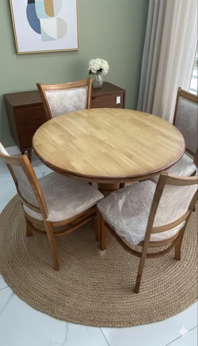 📝 Fiche Technique – Table avec 4 Chaises 📌 Caractéristiques générales : • Type : Table à manger avec 4 chaises • Fabrication : Locale 🇩🇿 🪵 Matériaux : • Tabl
