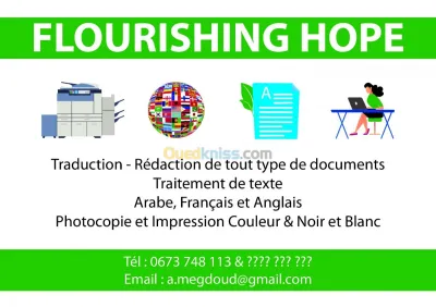 Tout travaux de saisie Traduction de tout types de documents (ar,fe,eng) Correction et relecture Reformulation de textes Rédaction de contenu Transcription audio vidéo