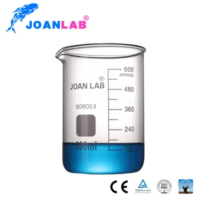 Bécher en verre FORME BASSE de forme cylindrique avec un fond plat et des graduations utilisé pour stocker, mélanger et chauffer des liquides en laboratoire. Il a un petit bec verseur pou