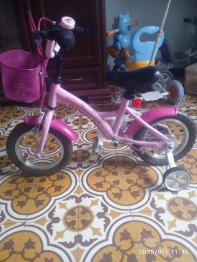 Vends très beau vélo enfant 14 pouces Decathlon français. Très bon état ramené de France avec roues pour bébé pour l'équilibre.