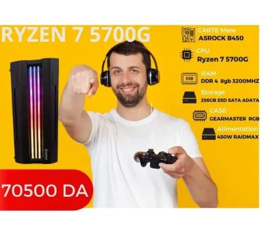 CONFIG CPU✅AMD RYZEN7 5700G TRY +FAN RGB RAM ✅ASGUARD 8GB DDR4 3200MHZ CARTE MERE ✅ASROCK B450 STORAGE ✅SSD 256GB ADATA GPU ✅VEGA 8 2000MHZ CASE ✅ GEAR MASTER 3 VENTILO RGB
