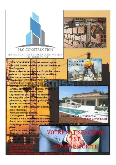 Pro-Construction TRAVAUX BATIMENT T.C.E est une entreprise de réalisation, renovation et restaurations propose a vous les différentes activités: -Tous travaux de démolitions et modific