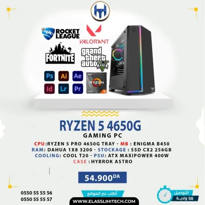 LA CONFIGURATION RYZEN 5 est dotĂ© dâun processeur AMD Ryzen 5 4650G , une RAM 8GB DE 3200MHZ DAHUA , un disque dur SSD 256 GB CX2, une carte mĂšre ENIGMA B450, une alimentation ATX MAXIPO