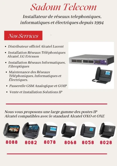 Sadoun Telecom expert de la vente et l'installation du matériel téléphonique depuis 28 ans vous propose une large gamme des postes Alcatel IP avec pleins d'options 8028, 8058, 8068, 8078