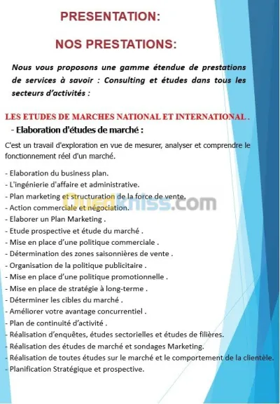 Nous sommes un bureau d'étude et de conseil, nous faisons: - Etude de cas - Etude de marché - Etude de faisabilité - Analyse sectorielle - Etude de projet - Analyse d'audiance -