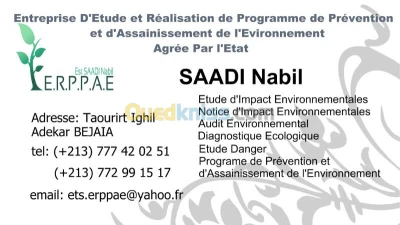 Bureau d'etude : etude d'impacte sur l'environnement, audit, notice, diagnostique , etude de danger, programme de prévention et d'assainissement de l'environnement et enfin suivi pour toute