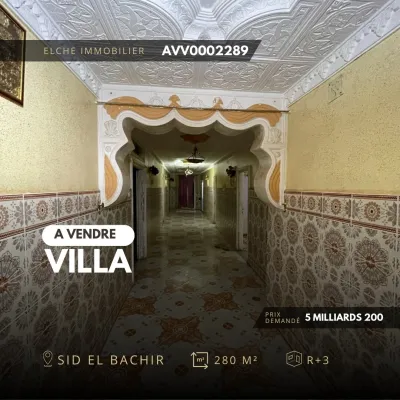 REF AVV0002289 A vendre une villa d'une superficie totale de 280m² , R+3 , Garage 3 voitures , située a sid el bachir , Oran. -acte notarié - deux façades de 15 m - 12 m Commodités int