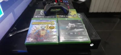 Xbox One 1T fat avec 1 Controller, jdid, avec 4 CDs; Vampyr. Darksouls3. Borderlands 3. Mortal combat X. + 40 jeuxs installeé avec l'argents, il ya 29 jeuxs de l'abonnement EA spor