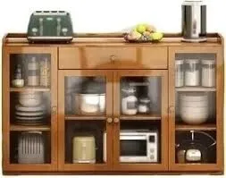 Buffet vitrine en bois massif avec un design élégant et une finition vintage. Il est composé de plusieurs espaces de rangement : Partie supérieure : 4 vitrines avec étagères en verre,