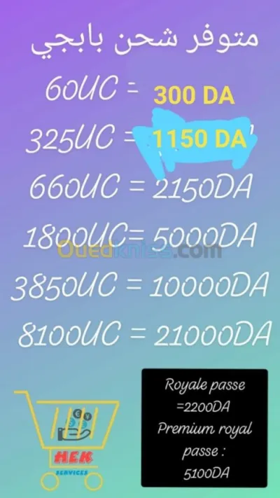 Bonjour, Disponible recharge Free fire, PUBG MOBILE et Steam Wallet: Free fire : 110 diamonds = 230 DA 231 Diamonds = 440 DA 583 Diamonds = 1100 DA 1188 Diamonds = 2100 DA Pubg mobil