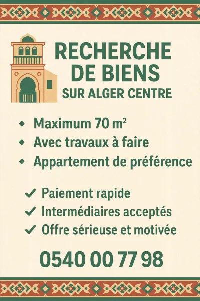 📢 Recherche de biens immobiliers à Alger Centre 📍 Je suis à la recherche de biens immobiliers à acheter sur Alger Centre, idéalement situés dans les quartiers centraux (Didouche