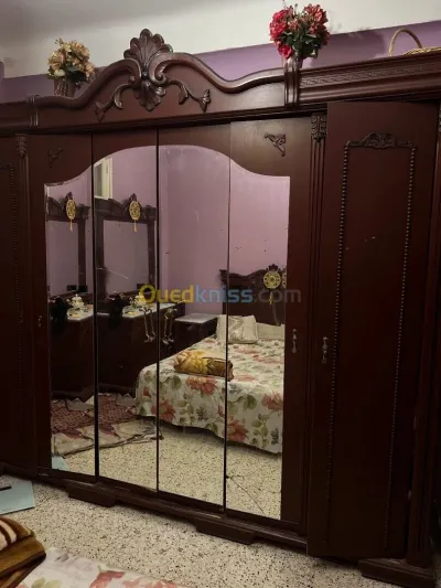 Vend état neuf belle chambre à coucher noire bois massif wengee armoire 3portes coulissante vitré dont 02 avec étagère et 01 penderie commode 04 tirroirs marbré et 02 chevets 04 tirroi