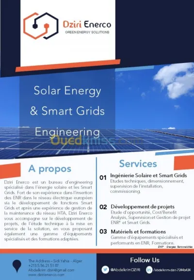 Dziri Enerco est un bureau d’engineering spécialisé dans l’énergie solaire et les Smart Grids. Fort de son expérience dans l’insertion des ENR dans le réseau électrique européen