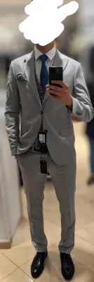 Costume grise 4 pieces 1- VESTE 2- GILET 3- CHEMISES 4- PANTALON + PAPILLON GRATUITE utilisé une fois Plus de détaille appeler la