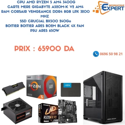 CPU : RYZEN 5 3400g CARTE MERE : GIGABYTE A520M-K V2 RAM : CORSAIR VENGEANCE 8G 3200MHZ SSD : CRUCIAL BX500 240G BOITIER : ARES B02M BLACK 4 FAN ALIMENTATION : ARES 650W